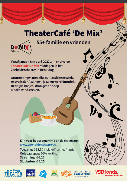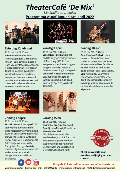 Ontmoetingen met elkaar, klassieke muziek, reisverhalen/lezingen, jazz- en wereldmuziek. Heerlijke hapjes, drankjes en soep uit alle windstreken. Kijk voor het programma en de tickets op: www.zeeheldentheater.nl